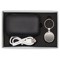 Подарочный набор в элегантной цветной картонной коробке серого цвета с конструкцией крышка-дно. Внутри расположены аккуратно закрепленные на ложементе внешний аккумулятор емкостью 10000 мА·ч с быстрой зарядкой, и металлический карманный брелок. Внешний аккумулятор обладает компактным дизайном и обеспечивает надежный запас энергии для мобильных устройств в пути, а стильный металлический брелок станет практичным и эстетичным аксессуаром для ключей. Этот набор идеально подходит в качестве презента для тех, кто ценит удобство, качество и современный стиль.