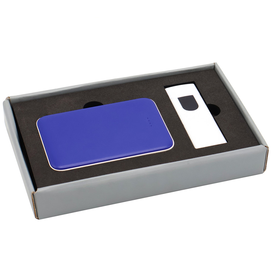 Подарочный набор в стильной цветной картонной коробке серого цвета (крышкой-дно). Внутри на аккуратном ложементе расположены внешний аккумулятор емкостью 5000 мА·ч и электронная зажигалка. Компактный и мощный внешний аккумулятор обеспечивает надежное подзаряжание мобильных устройств в любое время, а современная электронная зажигалка сочетает в себе удобство и безопасное использование без огня. Этот набор станет практичным и элегантным подарком для людей, ценящих функциональность и стиль.