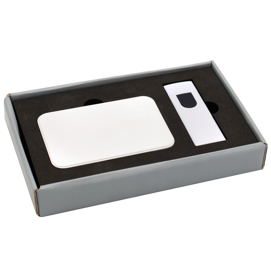Подарочный набор в стильной цветной картонной коробке серого цвета (крышкой-дно). Внутри на аккуратном ложементе расположены внешний аккумулятор емкостью 5000 мА·ч и электронная зажигалка. Компактный и мощный внешний аккумулятор обеспечивает надежное подзаряжание мобильных устройств в любое время, а современная электронная зажигалка сочетает в себе удобство и безопасное использование без огня. Этот набор станет практичным и элегантным подарком для людей, ценящих функциональность и стиль.