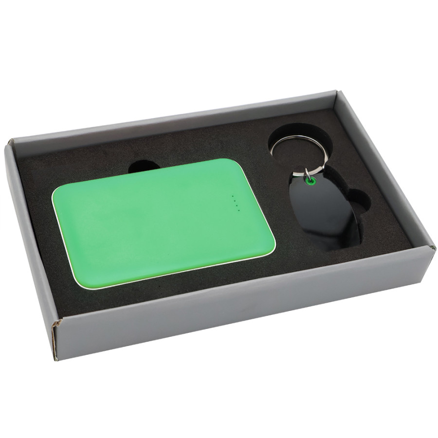 Подарочный набор в элегантной цветной картонной коробке серого цвета с конструкцией крышка-дно. Внутри расположены аккуратно закрепленные на ложементе внешний аккумулятор емкостью 5000 мА·ч и металлический карманный брелок. Внешний аккумулятор обладает компактным дизайном и обеспечивает надежный запас энергии для мобильных устройств в пути, а стильный металлический брелок станет практичным и эстетичным аксессуаром для ключей. Этот набор идеально подходит в качестве презента для тех, кто ценит удобство, качество и современный стиль.