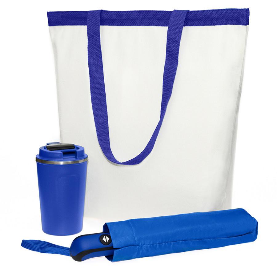В нем собраны три незаменимых аксессуара: стильный шоппер для покупок, термокружка для горячих напитков на ходу и надежный зонт, который защитит вас от непогоды.