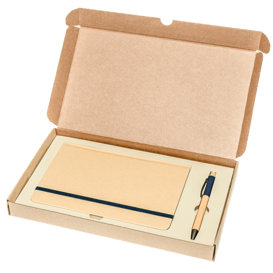 Подарочный набор в стильной картонной коробке бежевого цвета. Внутри на аккуратном ложементе располагаются блокнот в твердом переплете и ручка из бамбука.