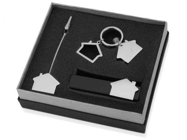 Создайте профессиональный и элегантный образ с нашим тематическим набором — отличным решением для организаций, занятых в строительной сфере, и не только. Этот изящный комплект включает визитницу, брелок и держатель для бумаг, выполненные из металла серебристого цвета в форме домика — символа надежности и профессионализма.