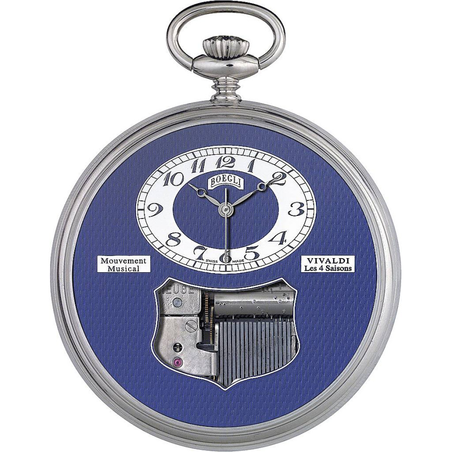 Ход карманных часов BOEGLI регулируется швейцарским механизмом с ручным заводом, оснащенным семнадцатью рубиновыми подшипниками. Скелетонизированный циферблат демонстрирует работу гребенчатого музыкального механизма, проигрывающего классическую мелодию.