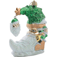 Зеленое елочное украшение "Месяц" Mister Christmas ярко и необычно украсит Ваш интерьер. Высота изделия 120мм. Внешний вид игрушки достаточно оригинален: это месяц в облике Деда Мороза с колпаком-елкой на голове, который венчает золотистая звезда. Окладистые борода и усы плавно переходят в снежную равнину на которой стоит небольшой домик. Через трубу в домик лезет Санта. К колпаку месяца с помощью небольшого колечка прикреплена голова еще одного Деда Мороза. Поверхность сувенира глянцевая за исключением белых деталей, которые покрыты блестками. Игрушка отличается разнообразным рельефом деталей. К елочному украшению прикреплена золотистая фактурная петелька и нить в тон. Полимерный материал, из которого изготовлен сувенир, не содержит вредных примесей и не загорается. Так же полимер невероятно прочен. При ударе о твердую поверхность или падении на пол игрушка останется целой. Украшение будет смотреться гармонично как на ветках ели, так и в новогодних композициях в качестве центрального элемента или как самостоятельное интерьерное украшение. Изделие отвечает современным требованиям и прошло экологический контроль. Выпущено ограниченной серией и только под маркой Mister Christmas. Упаковано в подарочную упаковку.