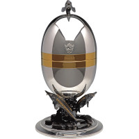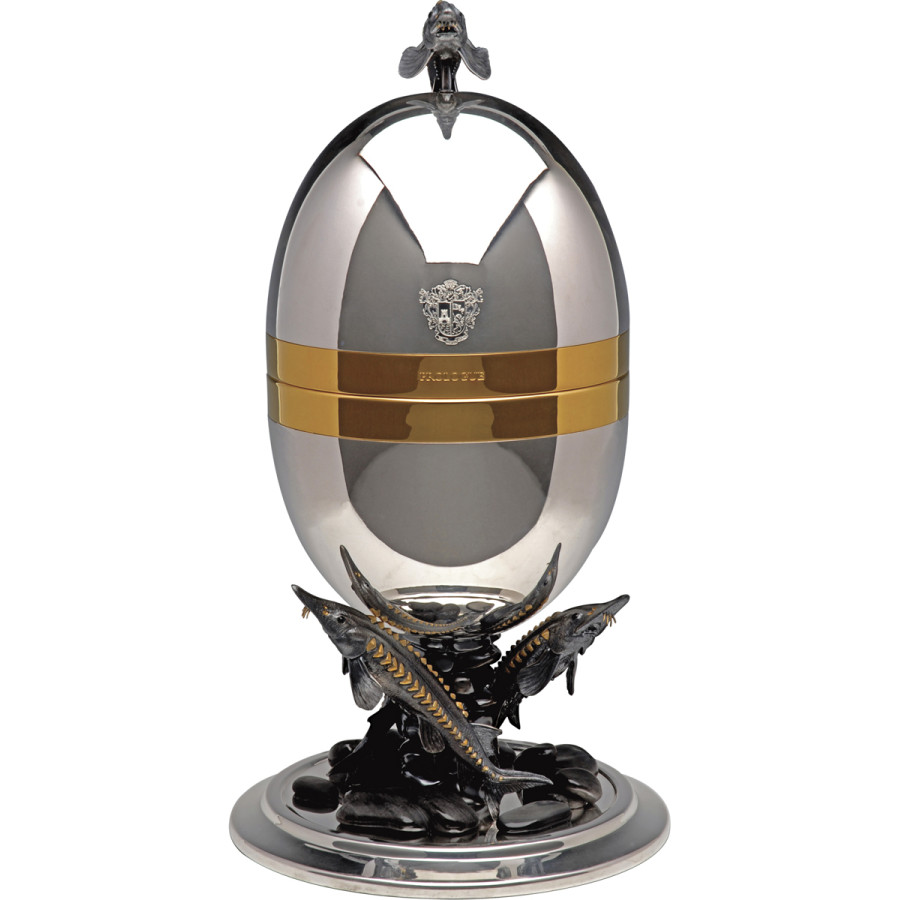 «Запретный плод сладок» - фраза, хорошо знакомая тем, кто любит жить красиво и наслаждаться удовольствиями, доступными лишь избранным. Икорница «Осетр» - знак высокого статуса и благополучия. Основная часть композиции (ювелирная латунь, покрытая серебром в 40 микрон) хранит от посторонних взглядов хрустальную чашу для икры. Она возвышается на постаменте из черной гальки, с поразительным мастерством вырезанной из обсидиана. В основании и на крышке неподвижно застыли рыбы (серебро, покрытое черным родием) – исполнение, достойное почетных обитателей Каспийского моря. В нижней половине центральной части композиции, отделенной позолоченным поясом, расположена емкость для льда, которая позволит подавать традиционное русское лакомство охлажденным. Все это составляет великолепный ансамбль и емкий символ величия.