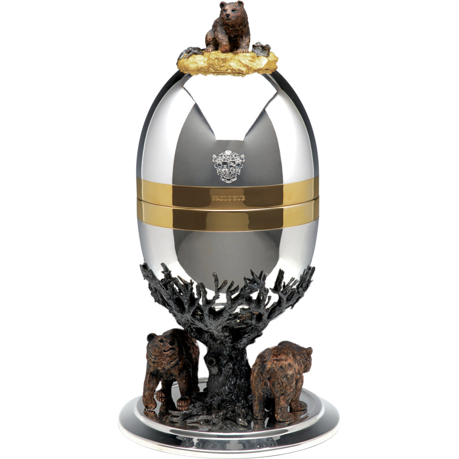Вкусовые качества крепкого напитка сохраняют две детали – крышка графина, покрытая золотом, и емкость для льда, спрятанная в нижней половине центральной части композиции. Кульминация сюжетной зарисовки - бурые медведи (серебро, покрытое медью), которые, как верные стражи, неустанно хранят ювелирный шедевр.