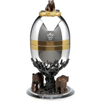 Набор с графином для водки «Бурый медведь» - произведение с истинно русским характером. На основании (ювелирная латунь, покрытая серебром в 40 микрон), возвышается могучее дерево – символ мироздания, плодородия и новой жизни. Густые ветви благородного древа (серебро, покрытое черным родием), извиваясь и переплетаясь, надежно и крепко держат смысловой центр композиции (ювелирная латунь, покрытая серебром в 40 микрон), под роскошной «скорлупой» которого, спрятаны хрустальный графин для водки и три рюмки.
