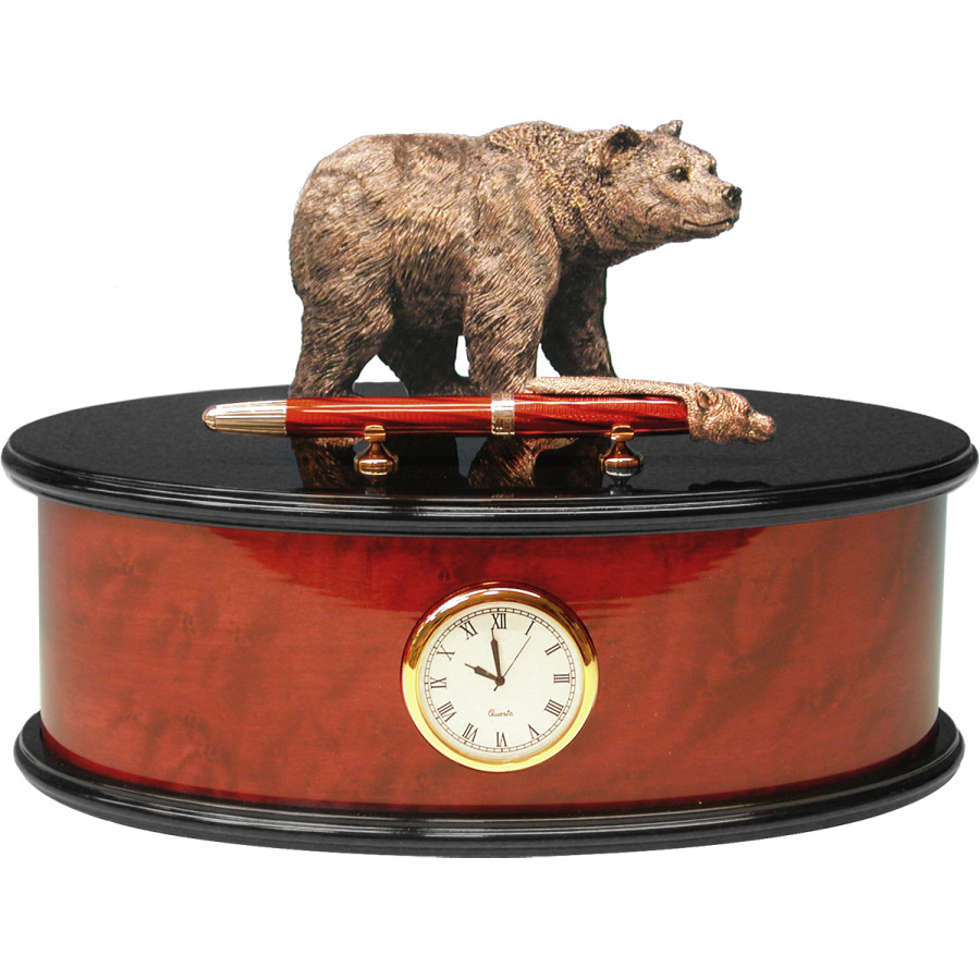 На подставке из ценных пород дерева, покрытой вручную многочисленными слоями черного и красного рояльного лака, располагаются два произведения ювелирного искусства - проработанная до мельчайших деталей фигура медведя и эксклюзивный пишущий инструмент. Фигура величественного тотемного животного выполнена из стерлингового серебра со специальным покрытием (медь), придающим «шкуре» декоративного медведя искристо-золотой окрас.