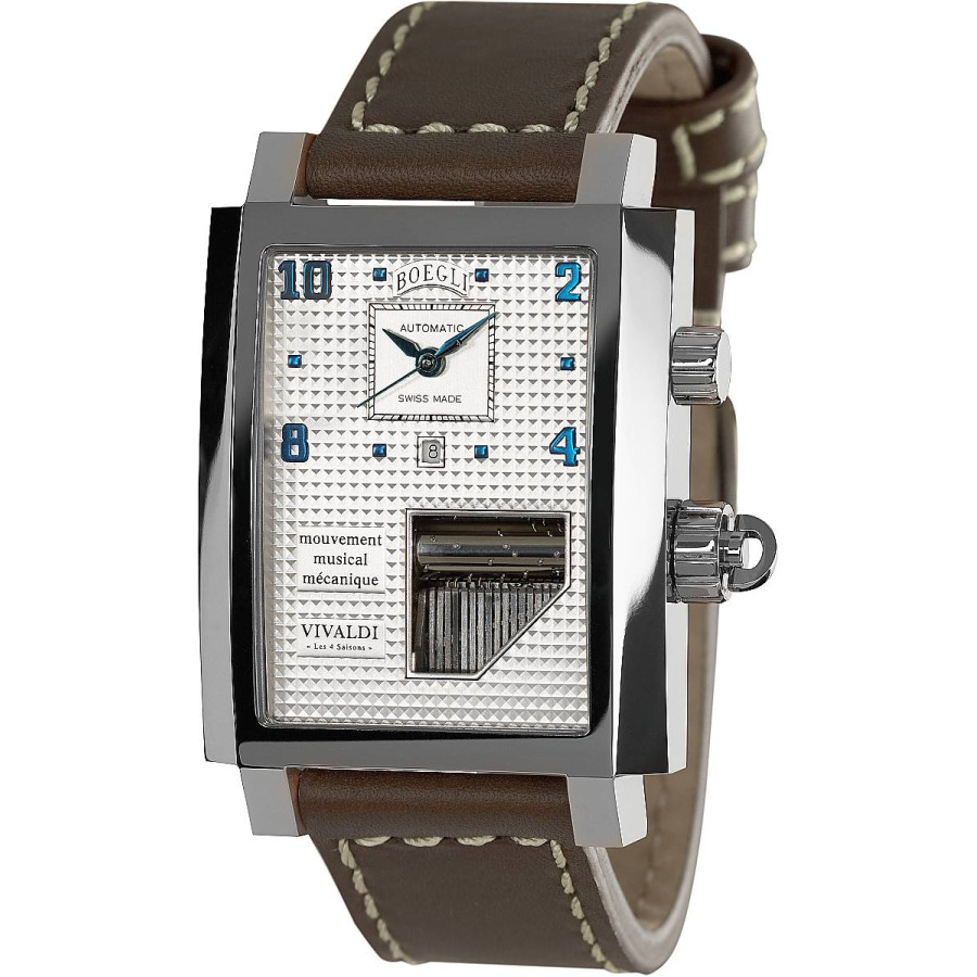 Механические часы, усложненные дополнительными функциями, в последнее время особенно актуальны. Тем более ценны часы, имеющие набор уникальных функций. Несколько лет назад швейцарская марка Boegli заявила о разработке первых механических наручных часов, усложненных функцией будильника и музыкальной мелодией. Великий эксперимент часовых мастеров завершился триумфальным выходом серии первых и единственных в мире наручных часов с музыкальным механизмом, играющий в назначенное время сложные мелодии Моцарта и Вивальди.
