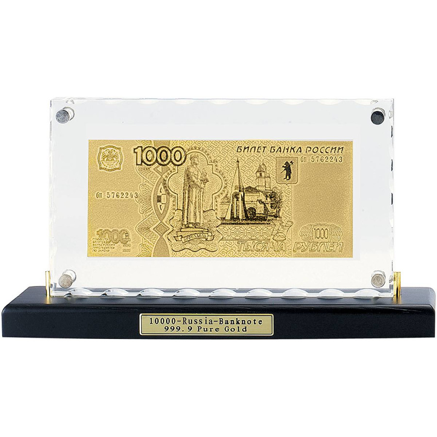 Перед вами настольный вариант точной копии банкноты в 1000 рублей, выполненной из сусального золота 999, 9 Такой набор является одновременно и глубоко символичным, и универсальным подарком.