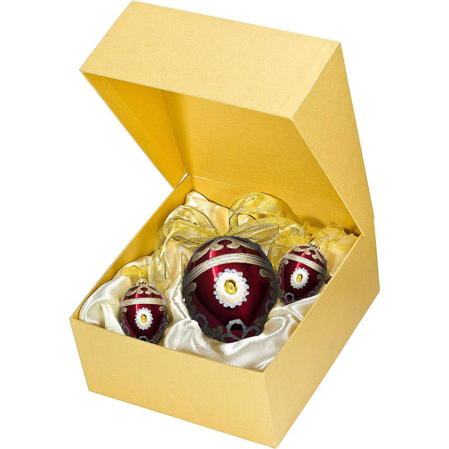 В новогодний праздник каждый ищет красивые подарки и ожидает чего-то необычного взамен. Набор из 3 коллекционных украшений непременно удивит всех. Все украшения из коллекции Imperia Collection привлекает богатством красок. Этот набор украшений выполнен в королевских цветах – бархатный красный и золотой. На красном фоне дизайнеры сделали золотистый орнамент. Все украшения этого набора имеют форму яйца. Два коллекционных украшения из стекла высотой 5 см, одно – 13 см. Для изготовления набора коллекционных украшений в мастерской Mister Christmas используют качественное стекло. Несмотря на толщину стекла, украшения все-таки весьма хрупкие. Сверху каждого изделия сделано специальное крепление для нити. Дизайнеры украсили его бантом из красивой ленточки золотистого цвета. Каждый набор из 3 коллекционных украшений сопровождается специальной подарочной упаковкой. Прочная коробка в приятной золотой гамме с фирменным логотипом не только надежно сохраняет украшения из стекла, но и делает их еще более торжественными. Такого поистине королевского подарка достойны ваши самые близкие и любимые. Набор украшений сувенирных из стекла Imperia Collection уже ждет Вас в магазине.