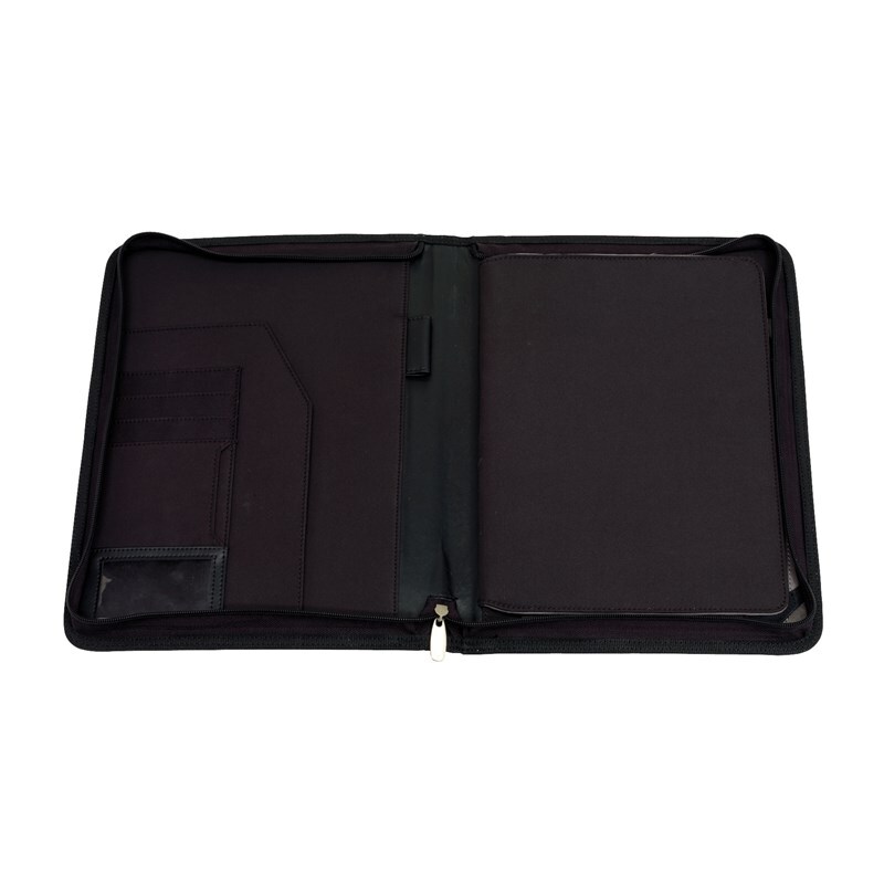 Папка NOBLESSE в формате DIN-A4: встроенный держатель для планшетного компьютора 3-х размеров (24х17, 5 см, 22х15, 5 см, 18х11, 5 см) с эластичными ремешками для закрепления с бархатными покрытием для аккуратной транспортировки, внутри различные отделения для визиток и записок, петелька для закрепления записывающего устройства, по периметру застёжка-молния