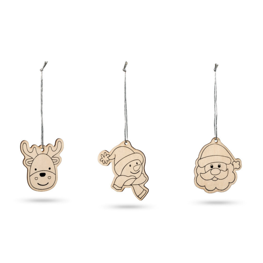 Деревянный набор для раскрашивания. Включает 3 новогодних украшения с изображениями для раскрашивания, ленты для подвешивания и 4 цветных карандаша. As the product is made from natural materials, the colour and size of the product and the printing result may vary between products. 122 x 94 x 14 мм
