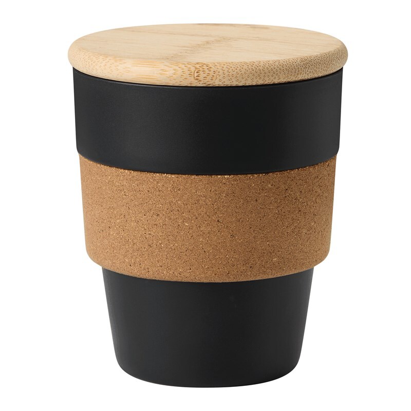 Кружка для напитков TRAVEL GRIP : изготовлена из пластика, поверхность из пробкового дерева, съемная бамбуковая крышка с силиконовым уплотнительным кольцом, объем около 350 мл.