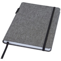 Блокнот формата А5 с отделкой из переработанного ПЭТ. Содержит 96 листов в линию плотностью 70 г/м², изготовленных из переработанной бумаги, с петлей для ручки и лентой-закладкой. В упаковке из картона.