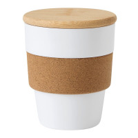 Кружка для напитков TRAVEL GRIP : изготовлена из пластика, поверхность из пробкового дерева, съемная бамбуковая крышка с силиконовым уплотнительным кольцом, объем около 350 мл.