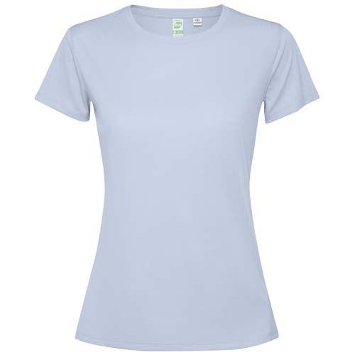 Приталенная футболка из технической ткани с короткими рукавами для женщин. Воротник со швами в цвет. Подол сзади немного длиннее переда. Боковые швы смещены вперед.