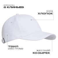 Бейсболка-шестиклинка с классическим изогнутым козырьком и застежкой на ленту с металлическим замком в тон основному цвету изделия.