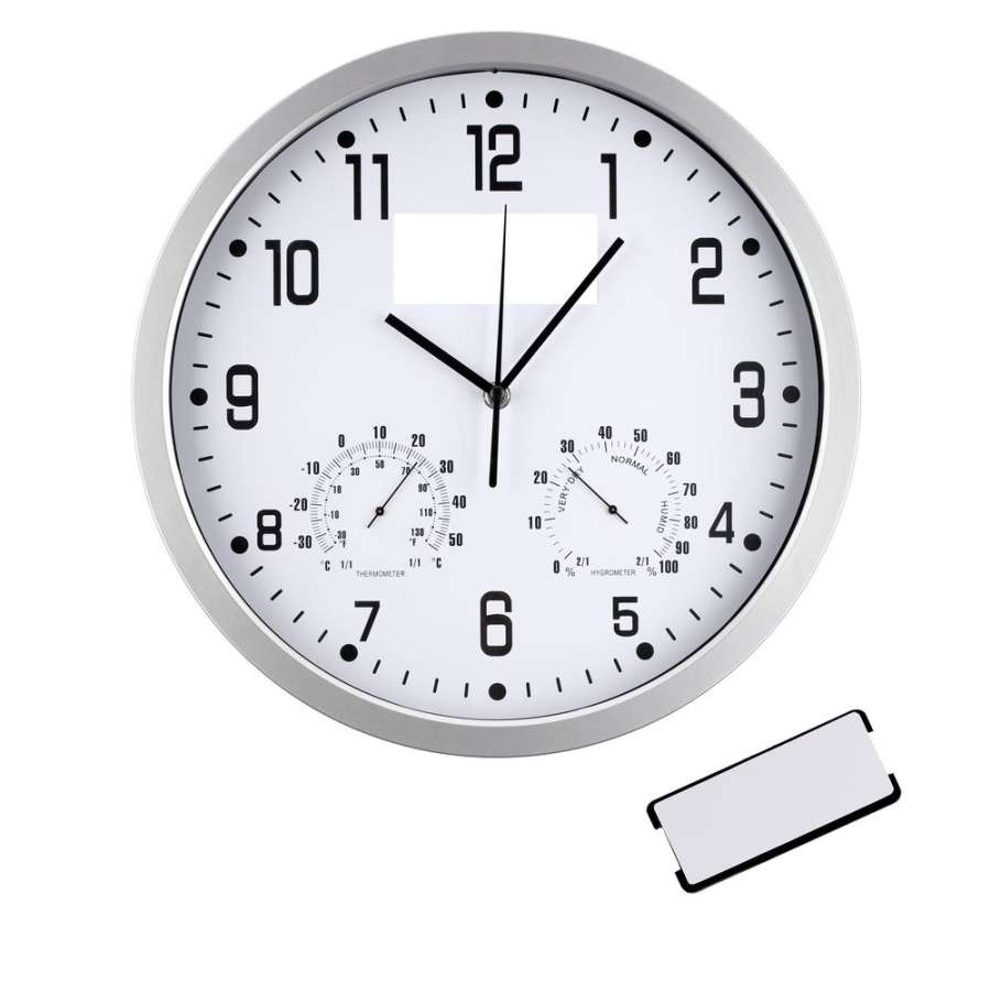 Классические настенные часы с термометром и гигрометром. В верхней части циферблата находится планка для нанесения логотипа, которая легко извлекается с тыльной стороны корпуса.