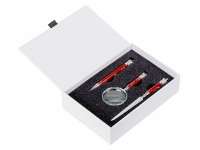 Подарочная упаковка: Набор представлен в жестком футляре из бордовой сплит- кожи с поролоновым ложементом, который гарантирует сохранность аксессуаров и подчеркивает ценность подарка.