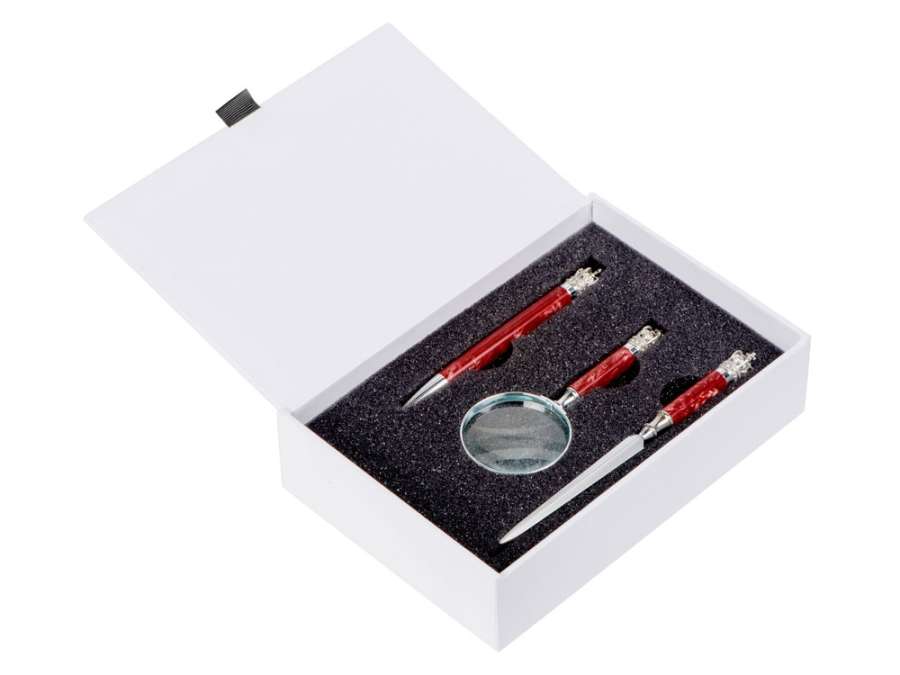 Поддержите свою продуктивность с набором, который объединяет стиль, функциональность и внимание к деталям! Комплектность: ручка шариковая d1, 1 х 13 см, лупа d5 х 12, 1 см, нож для бумаг d1, 1 х 16, 5 см