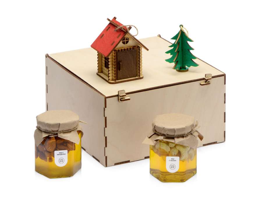 Оригинальный подарочный набор, в который входят: мед с кешью и мед с миндалем, а также новогодние украшения для вашей елки. Украшения выполнены вручную из березовой фанеры и будут замечательным подарком для любителей handmade игрушек.