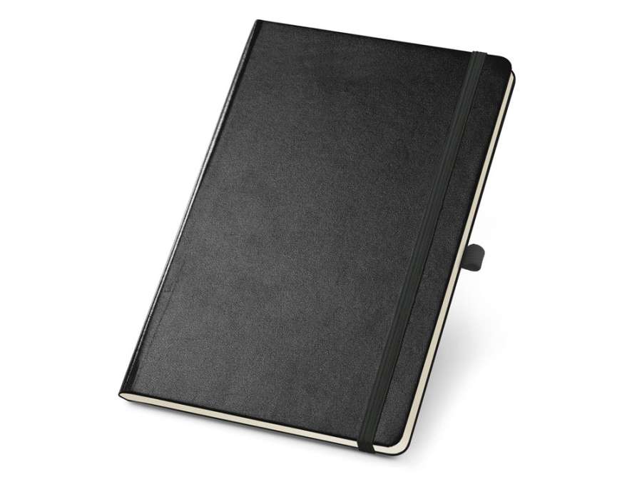 Блокнот формата A5 на 160 чистых страниц цвета слоновой кости, твердая обложка, внутренний карман, разделительная лента, резинка и имеет держатель для шариковой ручки (ручка в комплекте).