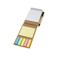 Липкий блокнот с шариковой ручкой. В блокноте 30 листов белой линованной бумаги плотностью 70 г/м2 (8 x 12 см). В комплект также входят 25 разноцветных (5 x 1, 2 см) и 25 желтых (7, 5 x 7, 5 см) клейких листочков, оба типа на бумаге плотностью 70 г/м2. Корпус шариковой ручки изготовлен из переработанной бумаги. Цвет чернил: черный. Длина непрерывной линии: 1000 метров. Размер пера: 1, 00 мм.