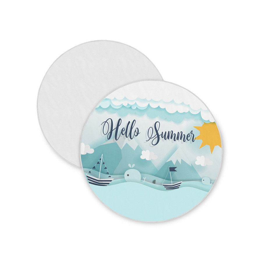 Необычный и трендовый вариант классического пляжного аксессуара. Круглая форма полотенца помогает быстро и удобно расстилать его на земле или шезлонге. Плотный полиэстер сохнет быстрее обычных тканей, поэтому полотенцу не требуется дополнительная упаковка после использования - достаточно ненадолго развесить его для просушки. Полноцветная печать на полотенце производится с помощью сублимации. Бахрома по краю может быть изготовлена в двух цветах (белый и чёрный) на выбор клиента.