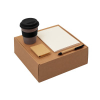 Материал: | блокнот- бумага из переработанных тетра-паков, ручка- картон,пластик, стакан- 50% бамбуковое волокно, 50% полипропилен, коробка- картон |