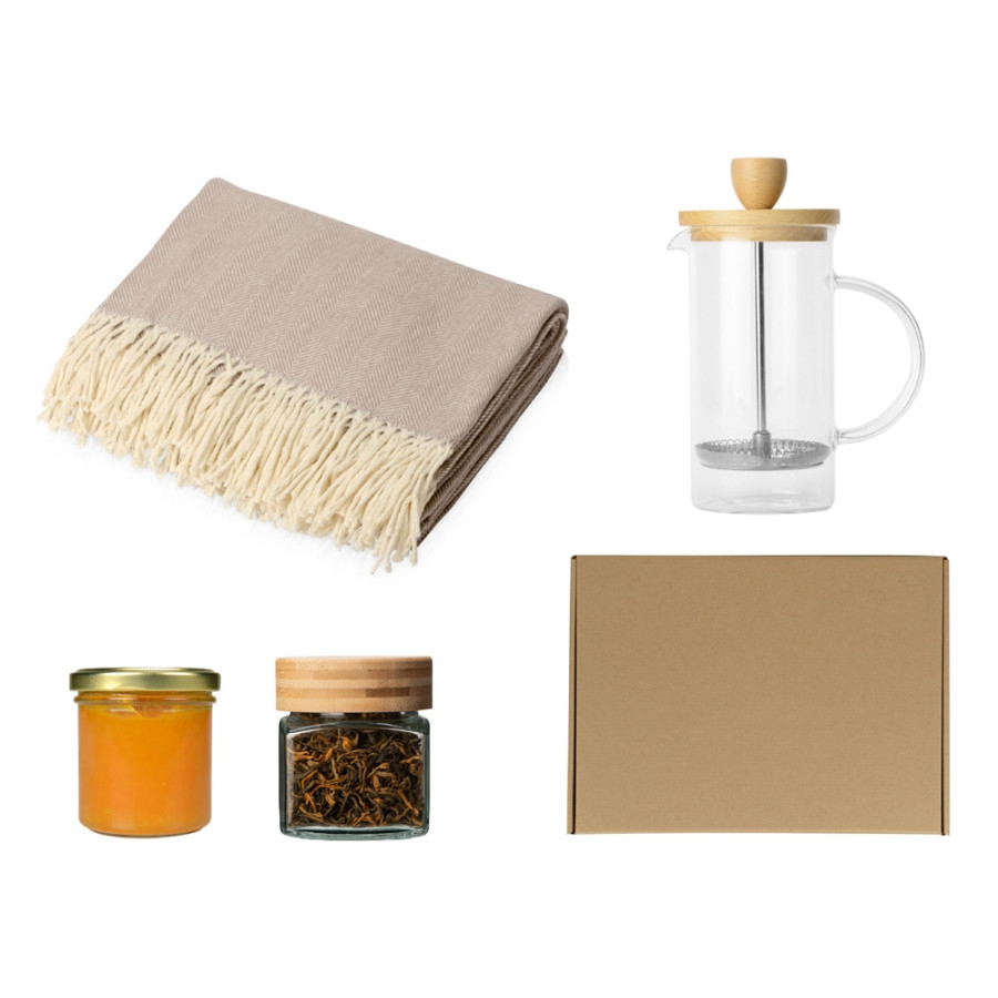 Подарочный набор с пледом, френчпрессом, чаем и вареньем, бежевый