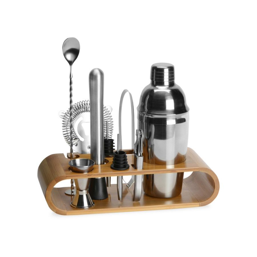 - шейкер 550 мл. Комплектность: бамбуковая подставка- 27, 3 х 10, 6 х 6, 6 см, барная ложка, джиггер 15/30 мл, гейзер -2 шт, мадлер, штопор, стрейнер, щипцы для льда, шейкер 550 мл