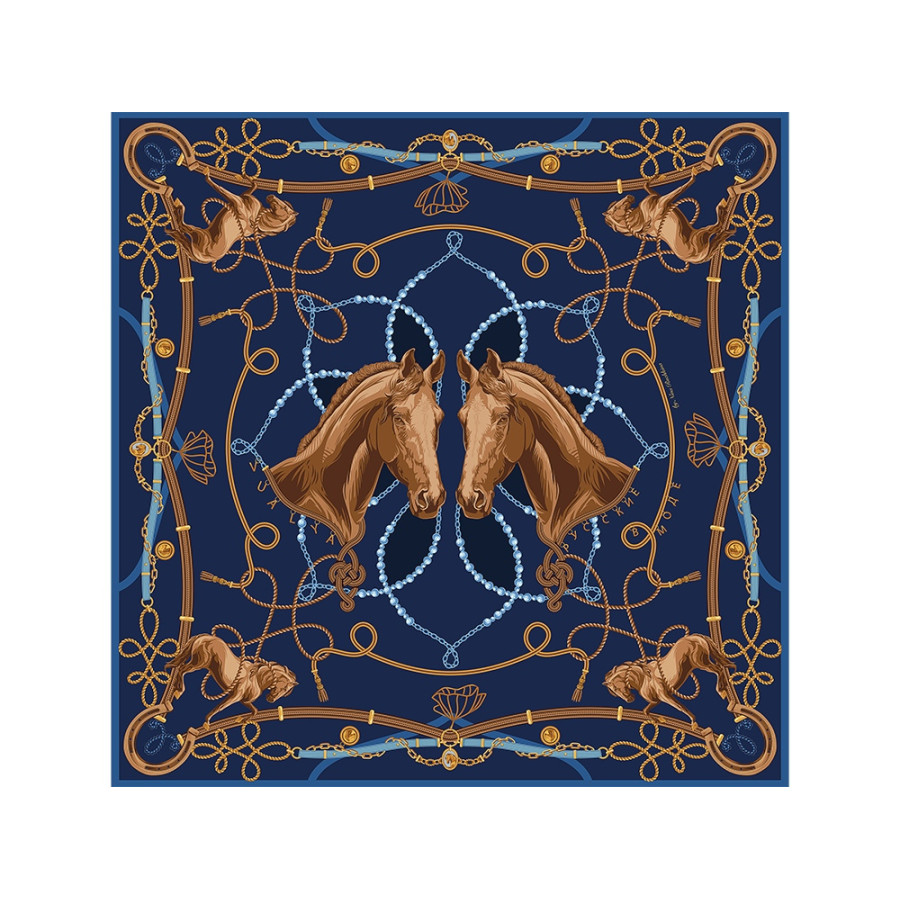 Платок Конный клуб вдохновлен духом русского аристократизма, тесно связанного с традициями верховой езды. Образ лошади, занимающий особое место в изобразительном наследии России, — от древнерусской миниатюры до современных шедевров живописи — ассоциируется с благородством, честью и внутренней силой. Платок воплощает эти возвышенные качества, отраженные в природной эстетике конного экстерьера.