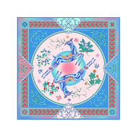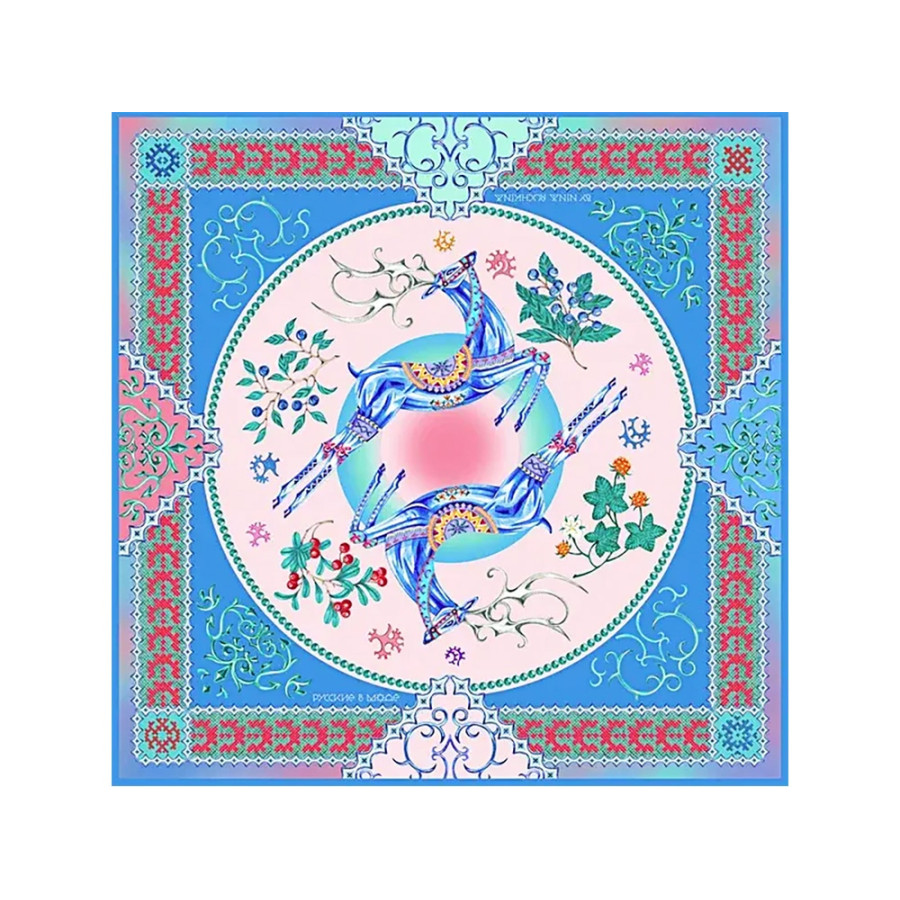 Платок обрамлен традиционными народными орнаментами – код, бережно передающийся из поколения в поколение, вобравший в себя благоговение перед могучей и прекрасной северной природой.