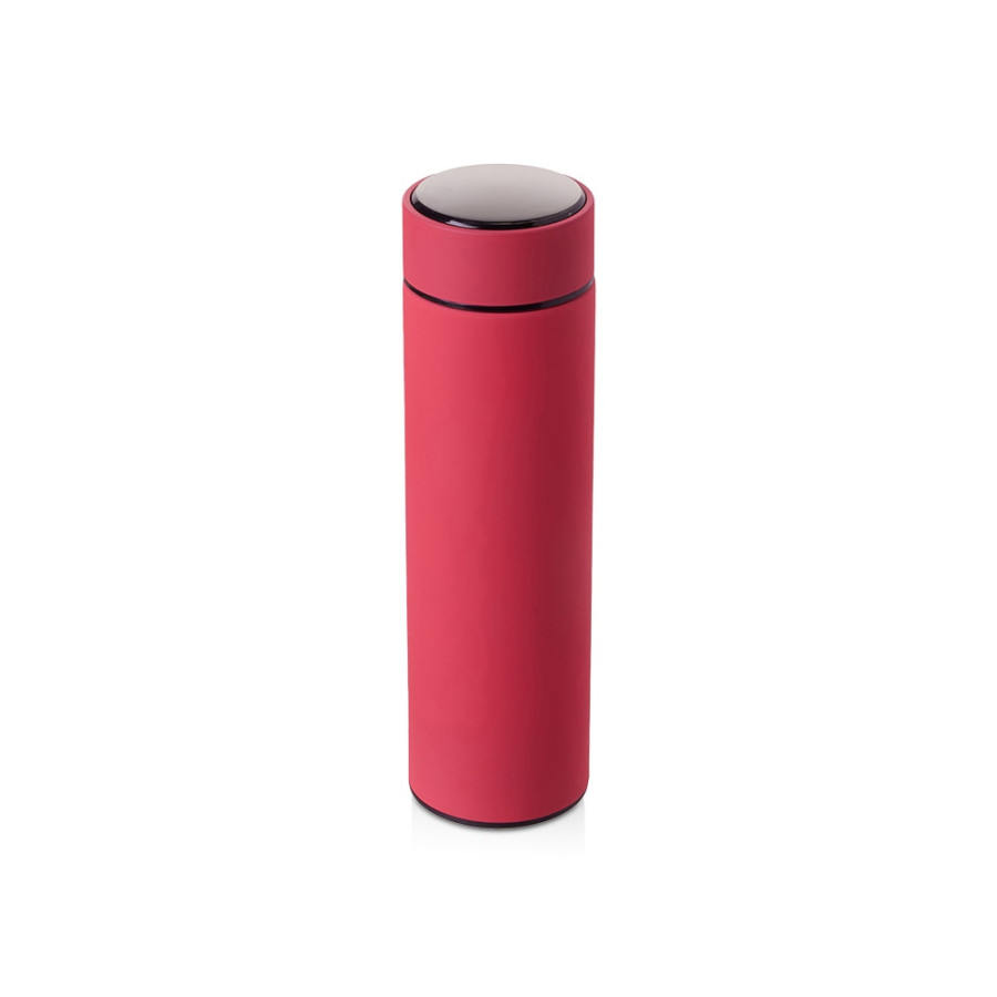 Термос из нержавеющей стали, покрытый цветным soft touch, с крышкой, в которой встроен термометр и LED дисплей, показывающий температуру внутри термоса. Объем: 500 мл. Упаковка: каждый термос в крафт коробке. Комплектность: термос, датчик температуры в крышке, ситечко, упаковка.