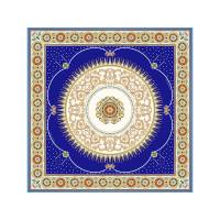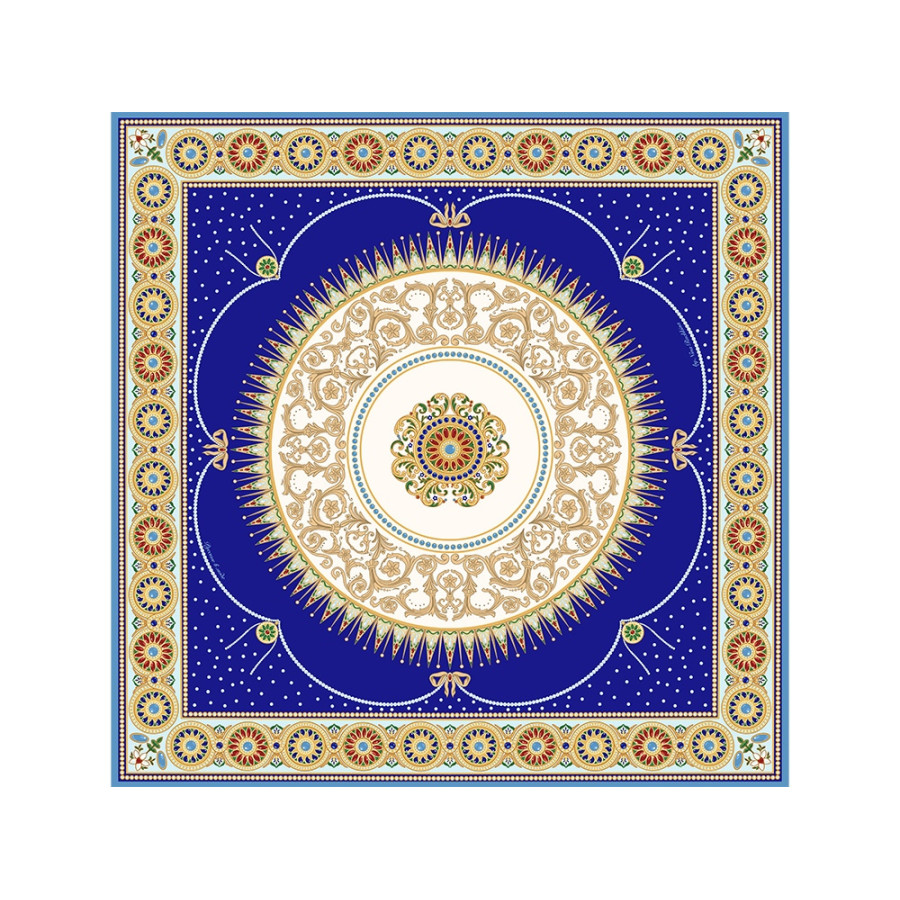 В центре полотна размещен изящный медальон, повторяющий оригинальный рисунок севрского фарфора, выполненного в ювелирной технике накладных эмалей и словно украшенного россыпью драгоценных камней. Цветовой строй воспроизводит парадную эстетику дворцового фарфора, где глубокий королевский синий в сочетании с золочёным орнаментом образуют гармоничное звучание.