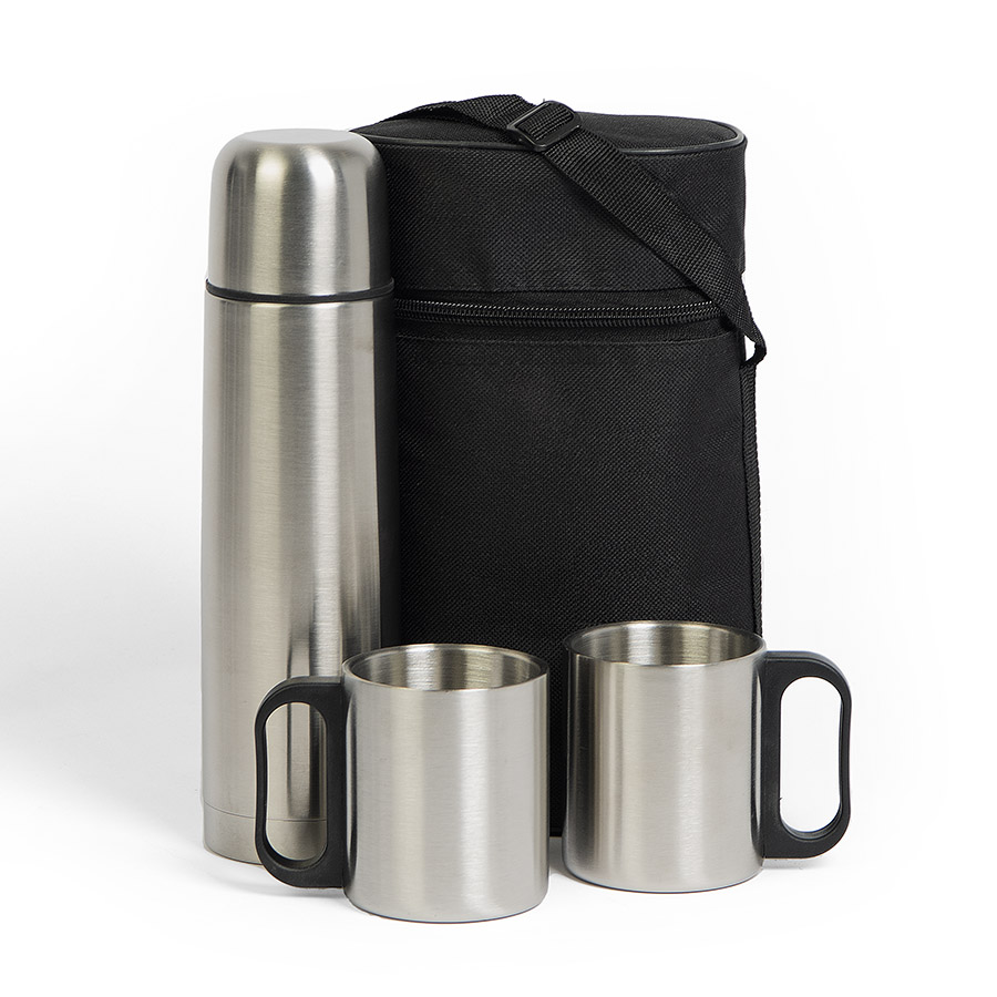 Универсальный набор с термосом на 0, 5 литра и двумя металлическими кружками в удобном нейлоновом чехле с ручкой.