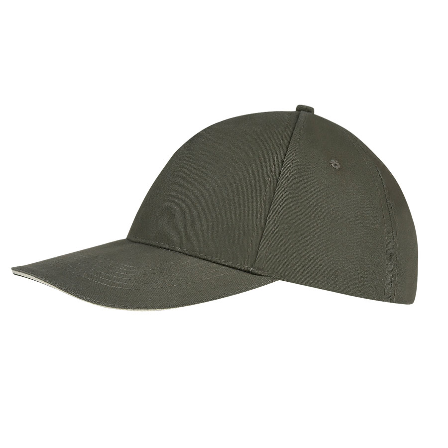 Бейсболка без шва на лбу, 5 клиньев, 4 вышитых люверса, двухцветный жесткий козырек "сэндвич", застежка-липучка.