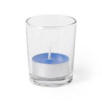 Свеча с ароматом лаванды в стеклянном стаканчике.
