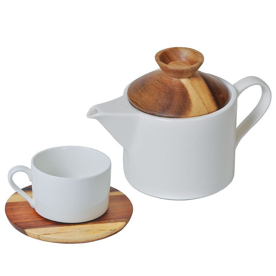 Крышечка чайника и подставка для чашки выполнены из акации, которая отличается особой прочностью и плотностью и поэтому не разбухнет от воды и влаги. Белый фарфор идеально сочетается с деревянными элементами. Только посмотрите на это великолепное стильное сочетание нежного молочного фарфора с пестрой текстурой дерева!