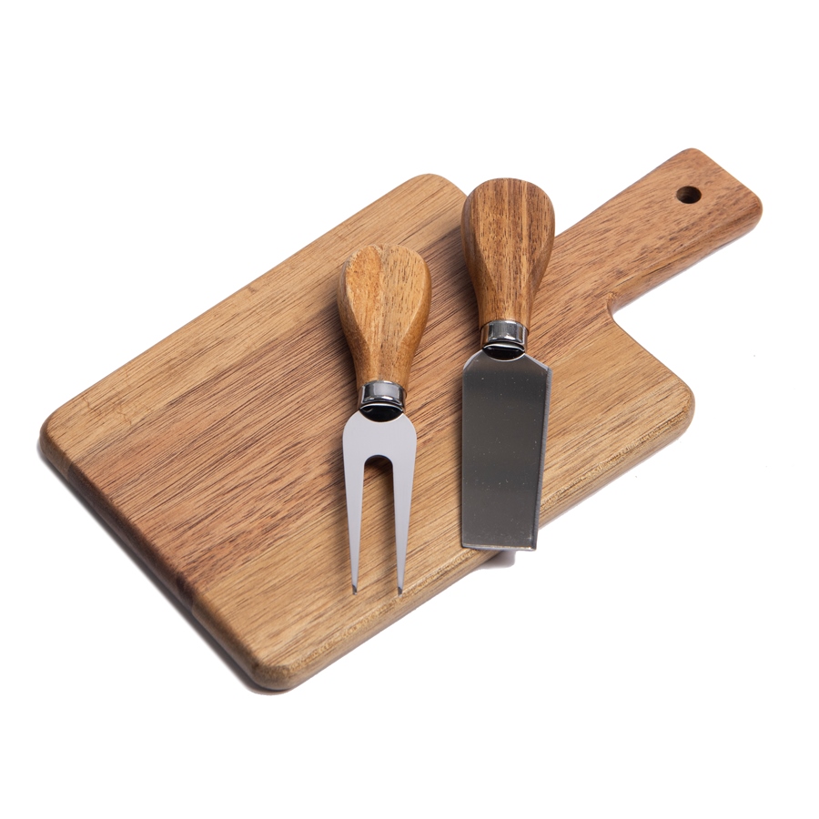 Набор для сыра: прямоугольная доска с ручкой и два инструмента в комплекте - нож для мягкого сыра и вилка.