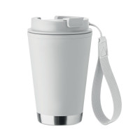 Double wall tumbler in PP inner wall, recycled PP outside wall, recycled stainless steel detail and RPET wrist strap. Capacity: 300 ml.
