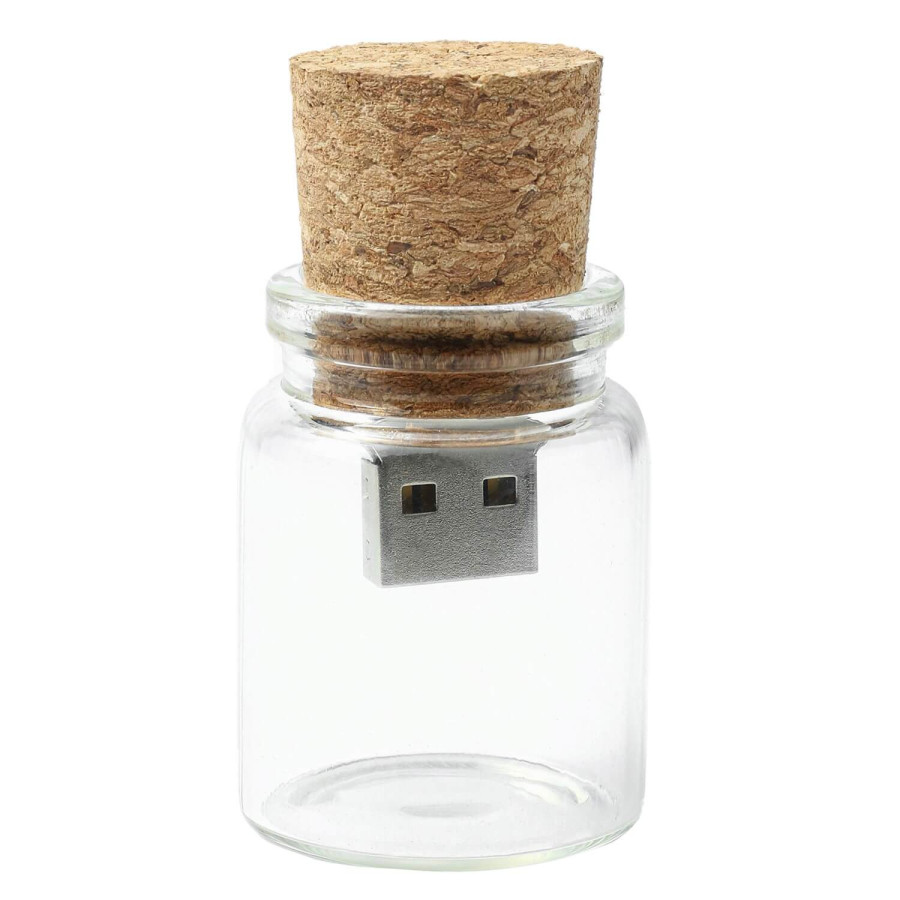 Флешка в виде стеклянной банки с пробкой. На корпус можно нанести УФ печать или гравировку.
